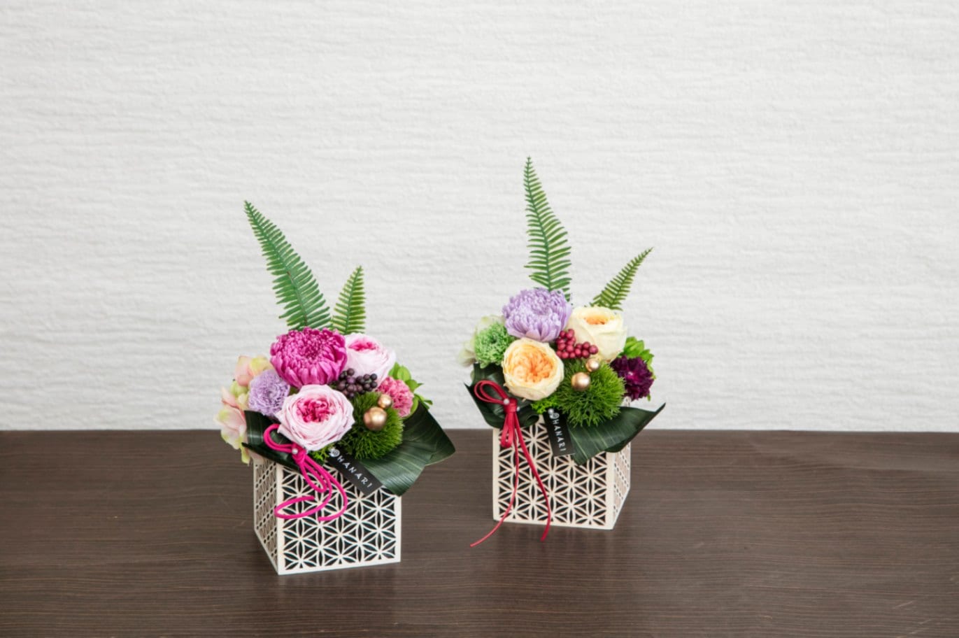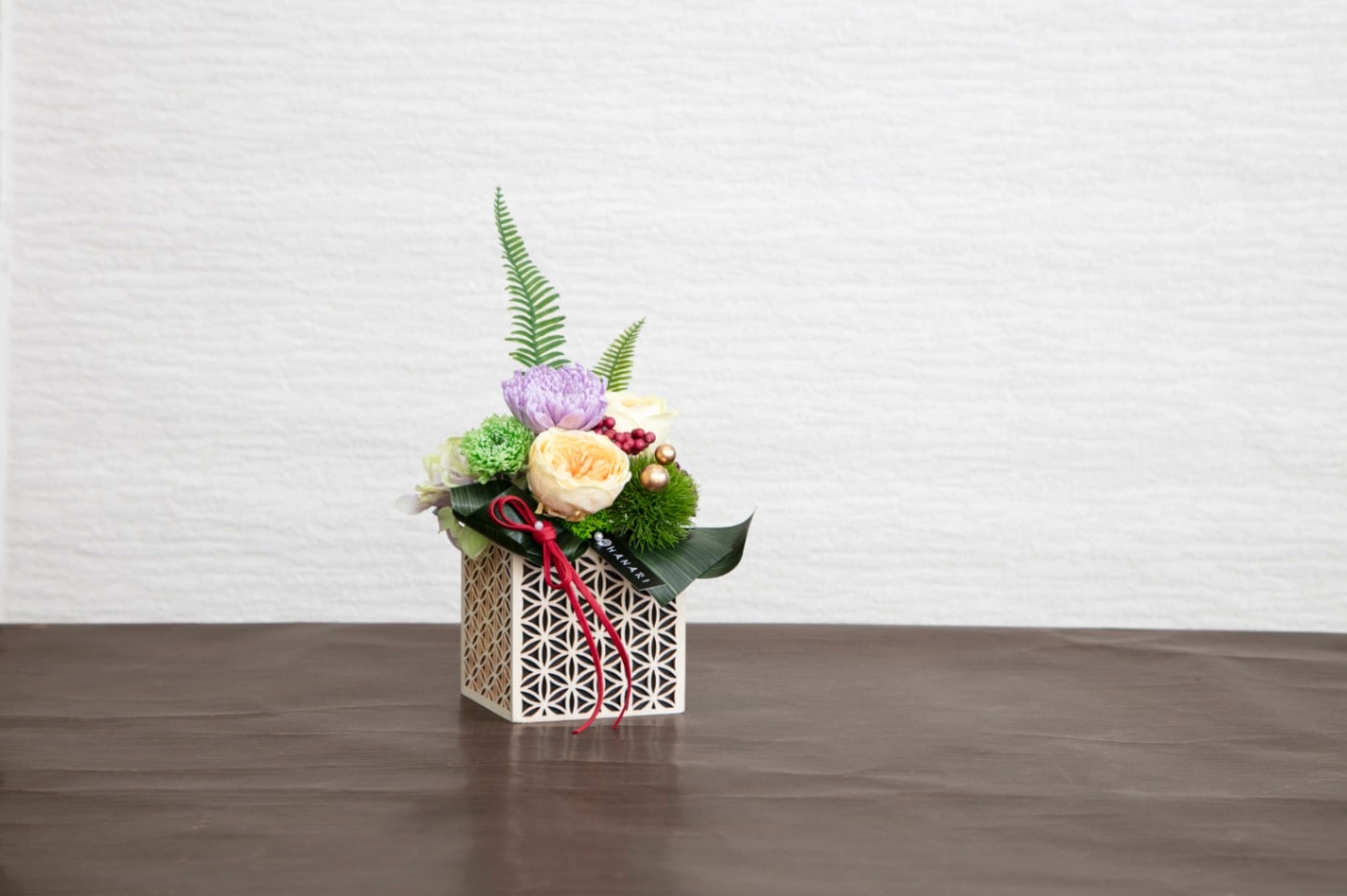 透かし彫りを思わせる木製花器に、輪菊や丸咲きのバラ等を堂々と飾った、和の佇まいを感じるアレンジ。ハランを模したリボンと、革紐風のリボンが雅な雰囲気を一層引き立てています。