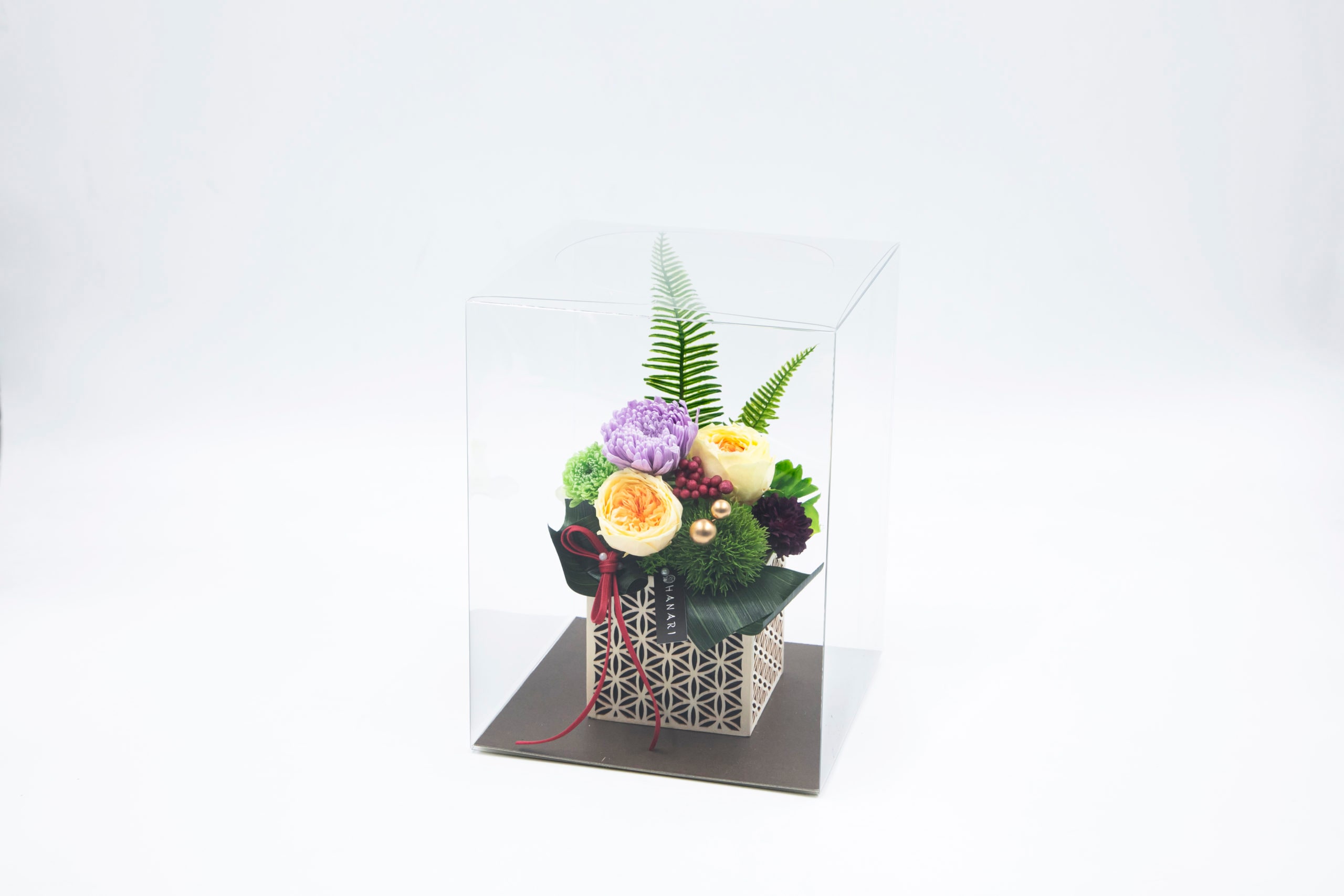 本体サイズ:横幅15cm×奥行12cm×高さ23.5cm(※多少の誤差はございます) ケースサイズ:横幅18cm×奥行18cm×高さ23.5cm 花材:プリザ―ブドフラワー アーティフィシャルフラワー 花器:木製花器