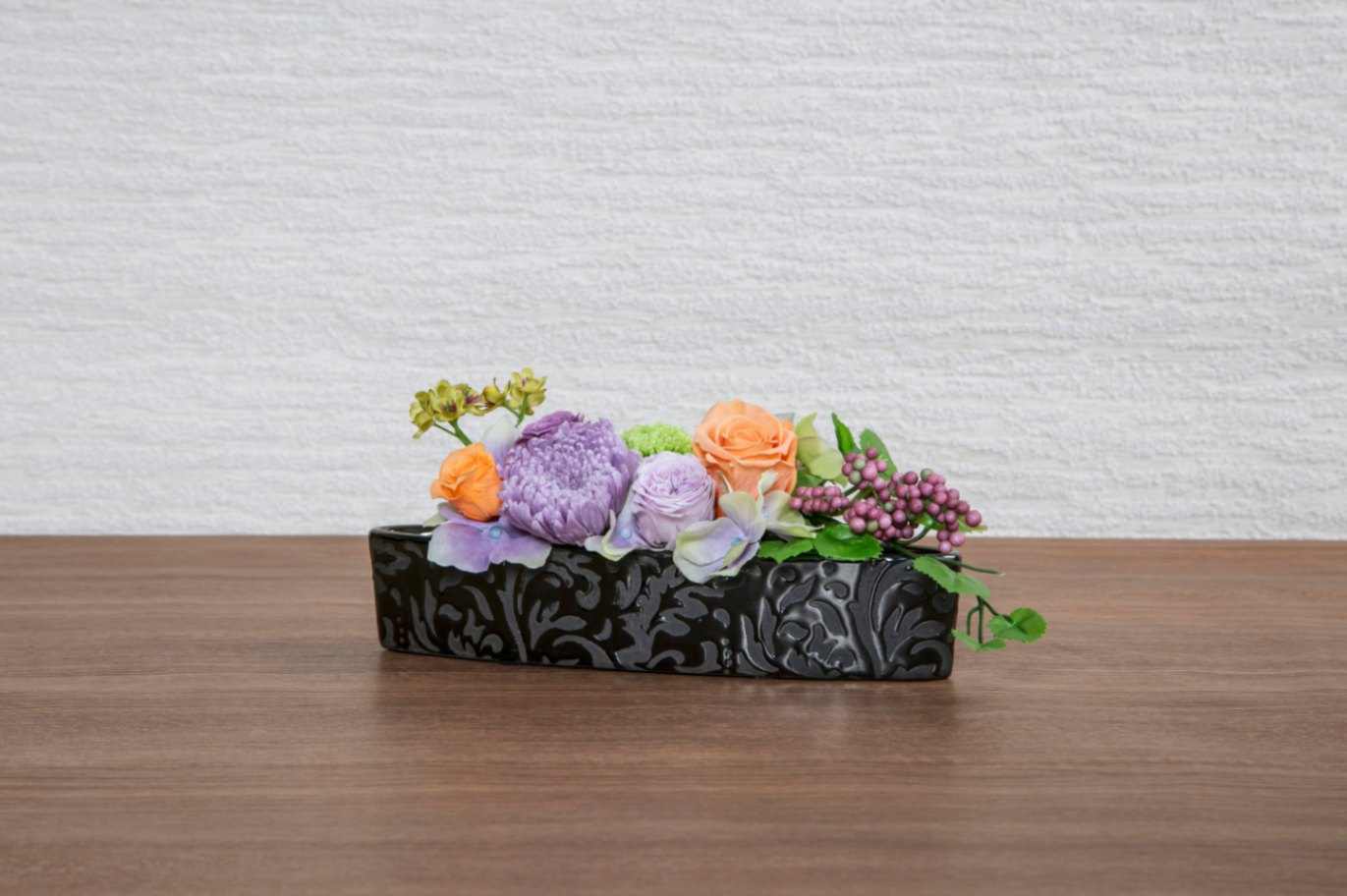 柔らかな陽射しの下で心地良く咲く花々をイメージした和モダンアレンジ。輪菊、ピンポンマム、バラとアートフラワーの小花を組み合わせ、軽やかな仕上がりに。全面に唐草模様が施された器は、艶があり高級感たっぷりです。
